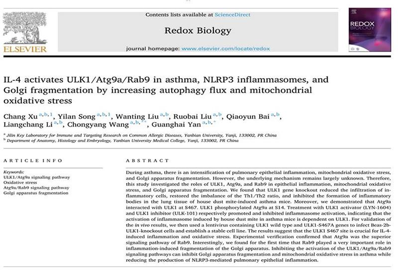 近日,金沙官网吉林省科技厅过敏性常见疾病免疫与靶向研究重点实验室医学院延光海教授团队在国际著名杂志Redox Biology(IF:11.4,双一区TOP期刊)上发表了题为IL-4 activates ULK1/Atg9a/Rab9 in asthma, NLRP3 inflammasomes, and Golgi fragmentation by increasing autophagy flux and mitochondrial oxidative stress的最新研究成果,该研究通过运用ULK1基因敲除小鼠等方法,揭示了在哮喘疾病中ULK1/Atg9a/Rab9信号通路对气道炎症、线粒体氧化应激和的高尔基体碎裂的影响。该研究为金沙官网医学院独立完成,医学院徐畅博士为第一作者,宋艺兰副教授为共同第一作者,延光海教授和王重阳老师为共同通讯作者。
