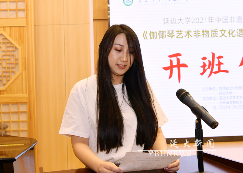 学员代表、吉林师范大学2019级艺术硕士赵清月发言,她表示,在未来的研修中,将满怀超高的学习热情,以自身的学习能力为基础,做到理论与实践相结合,努力实现创作能力、理论研究、实践能力、教学能力全面提升,学习期间将努力配合管理、实现文化交流,不遗余力地展示伽倻琴艺术的魅力,把握伽仰琴艺术非遗项目自身的传承发展规律,将此次研修作为中国朝鲜族伽倻琴艺术沟通的桥梁,珍惜机会,施展才能,争取成为伽倻琴艺术传承水平与实践能力兼备的高水平人才。
