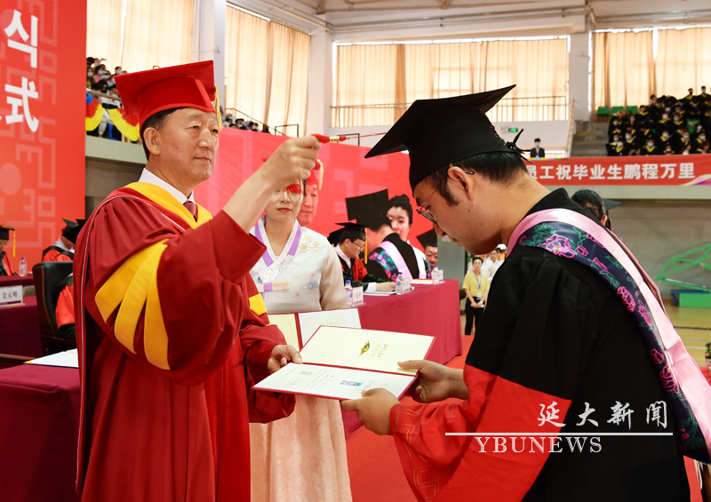 梁仁哲、金雄等领导向获奖学生代表颁发荣誉证书,向优秀毕业生代表颁发了毕业证书。金雄向毕业生代表颁发学位证书,并一一扶正流苏。