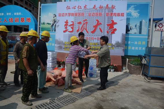 7月13日上午9时,随着一阵鞭炮声响起,js6668金沙登录入口附属医院(延边医院)新建内科大楼顺利封顶,这标志着大楼主体框架工程结束。js6668金沙登录入口附属医院(延边医院)副院长尹学哲亲自到施工现场慰问建设工人。