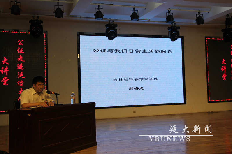 本次讲座邀请到了延边州公证协会副会长、珲春市公证处主任刘海龙作了题为“公正与我们日常生活的联系”的主题讲座。他在讲座中以延边州公证行业发展的现状;公证的主要功能和作用;公证与我们日常生活联系较为密切的公证事项为主要内容,向同学们详细介绍了公证的相关知识。整场讲座案例丰富,内容与日常生活联系密切、实用性强。讲座中,刘海龙主任还与现场同学进行了互动,回答了同学们的一些疑问,现场气氛活跃。