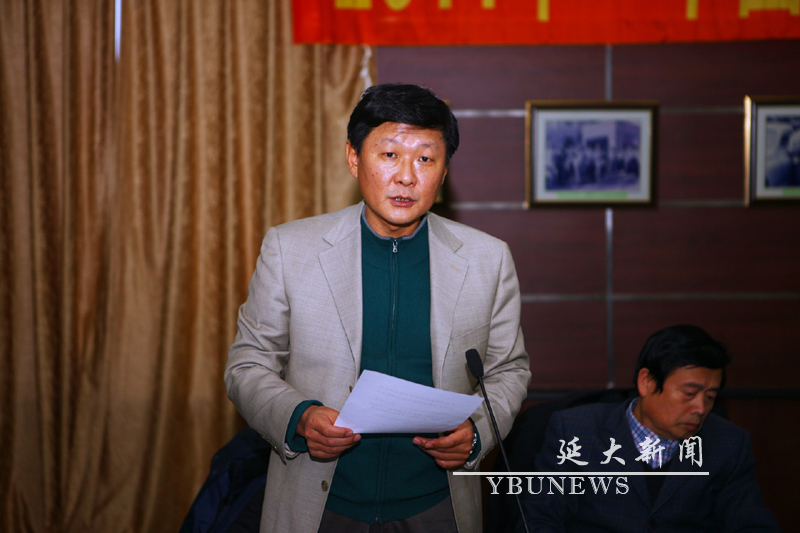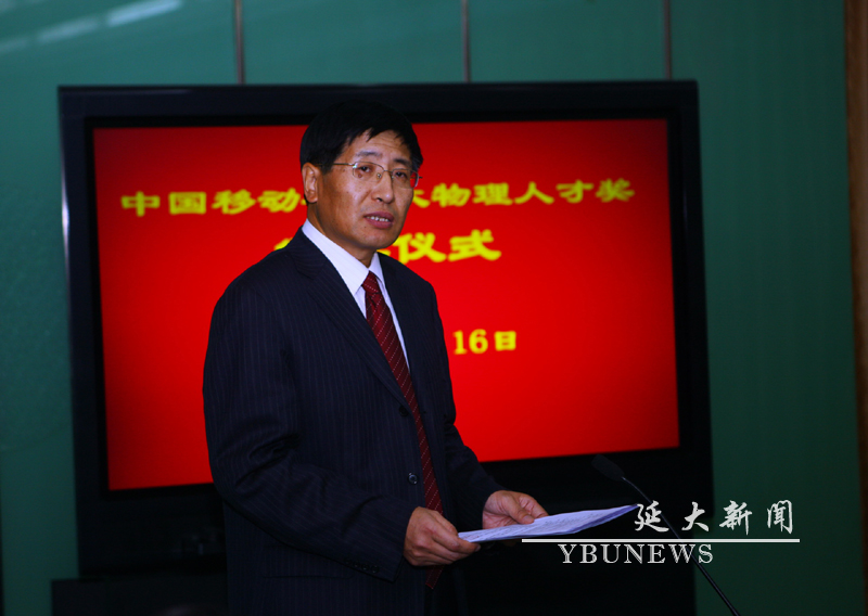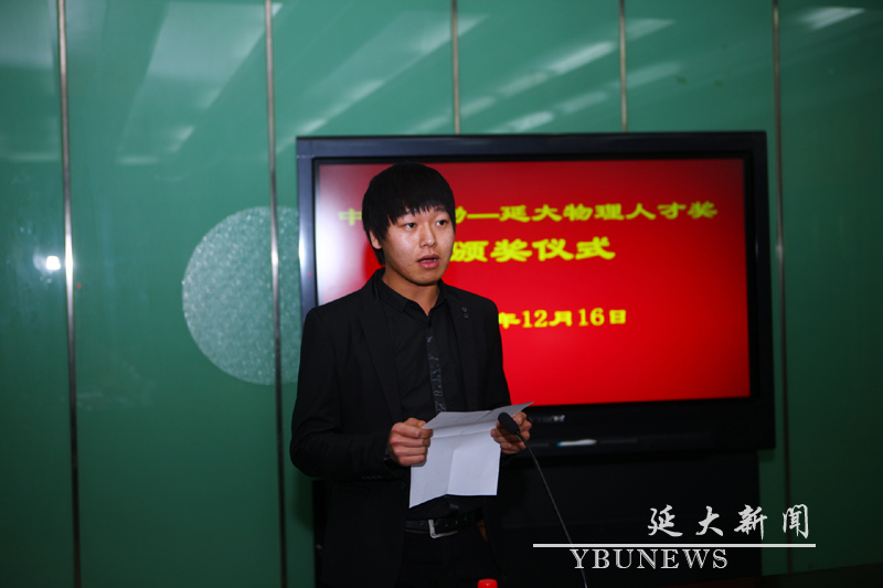物理学科发展促进会副会长、校基金会秘书长金日宣读颁发延大物理人才奖助学金的决定