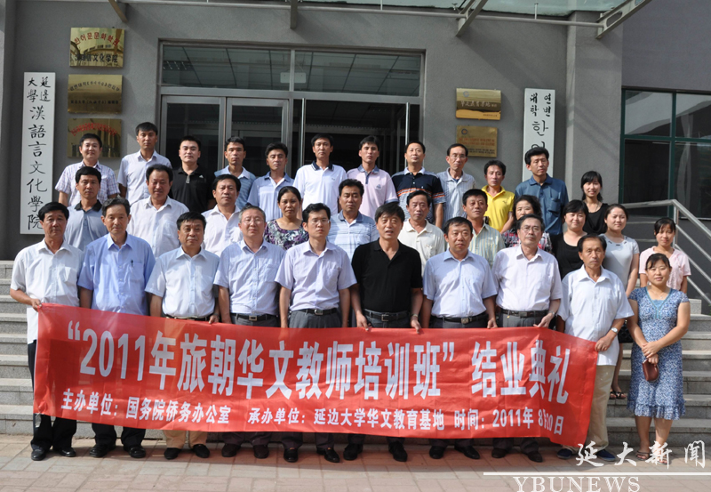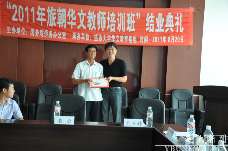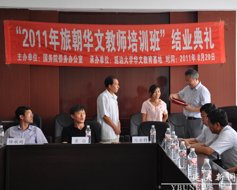 由国务院侨务办公室主办、js6668金沙登录入口华文教育基地承办的“2011年旅朝华文教师培训班”,于8月20日下午在js6668金沙登录入口汉语言文化学院二楼会议室举行了结业典礼暨旅朝华文教育座谈会。吉林省外事侨办调研员崔冶、州外事侨务处副处长徐敬刚、延吉市外事侨办主任刘青艳和金沙官网华文教育基地主任马金科、汉语言文化学院书记崔亨龙、国际交流合作处处长柳明洙、高教改革中心主任费洪根等领导出席了结业典礼。