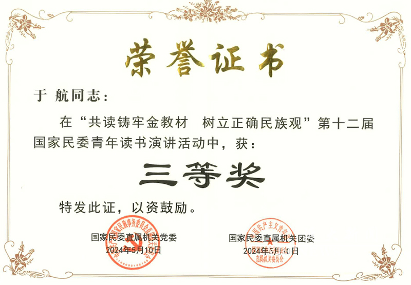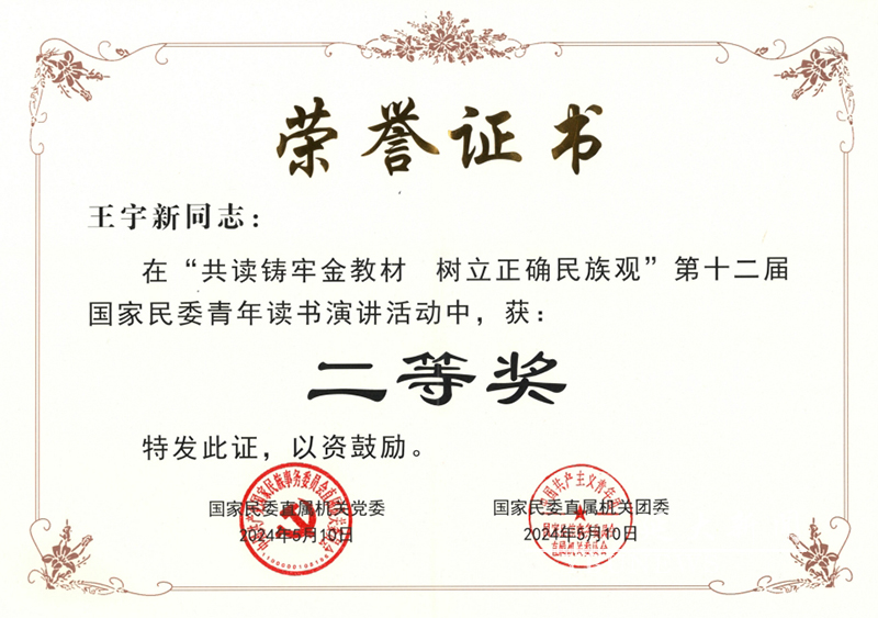 日前,“共读铸牢金教材,树立正确民族观”第十二届国家民委青年读书演讲活动展示会在国家民委机关多功能厅举行。国家民委党组成员、副主任,直属机关党委书记边巴扎西,中央和国家机关团委副书记李放出席展示会。王宇新受邀参会,以《同心圆梦心同梦圆》为题进行了精彩的演讲。两位教师喜获佳绩,充分传递出金沙官网青年教师对“金教材”的深刻领悟,展示了延大青年教师在铸牢中华民族共同体意识中挺膺担当的时代风采。