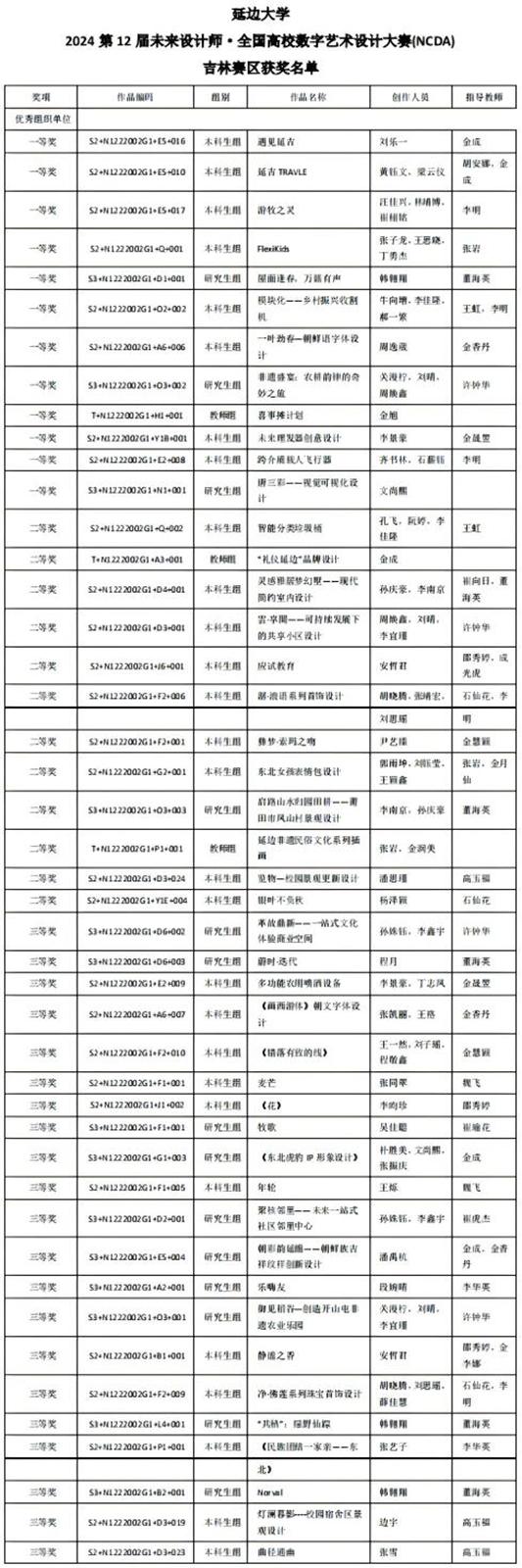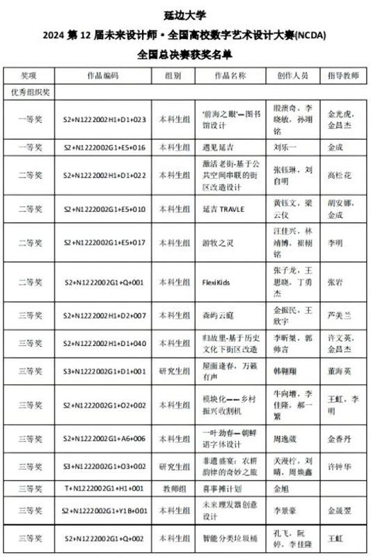 (教务处供稿)日前,2024年(第12届)未来设计师·全国高校数字艺术设计大赛(NCDA)获奖结果揭晓。金沙官网师生在本次比赛中荣获国家级一等奖2项、二等奖4项、三等奖9项,省级一等奖12项、二等奖12项、三等奖21项,学校荣获吉林省优秀组织奖和全国优秀组织奖两项殊荣。