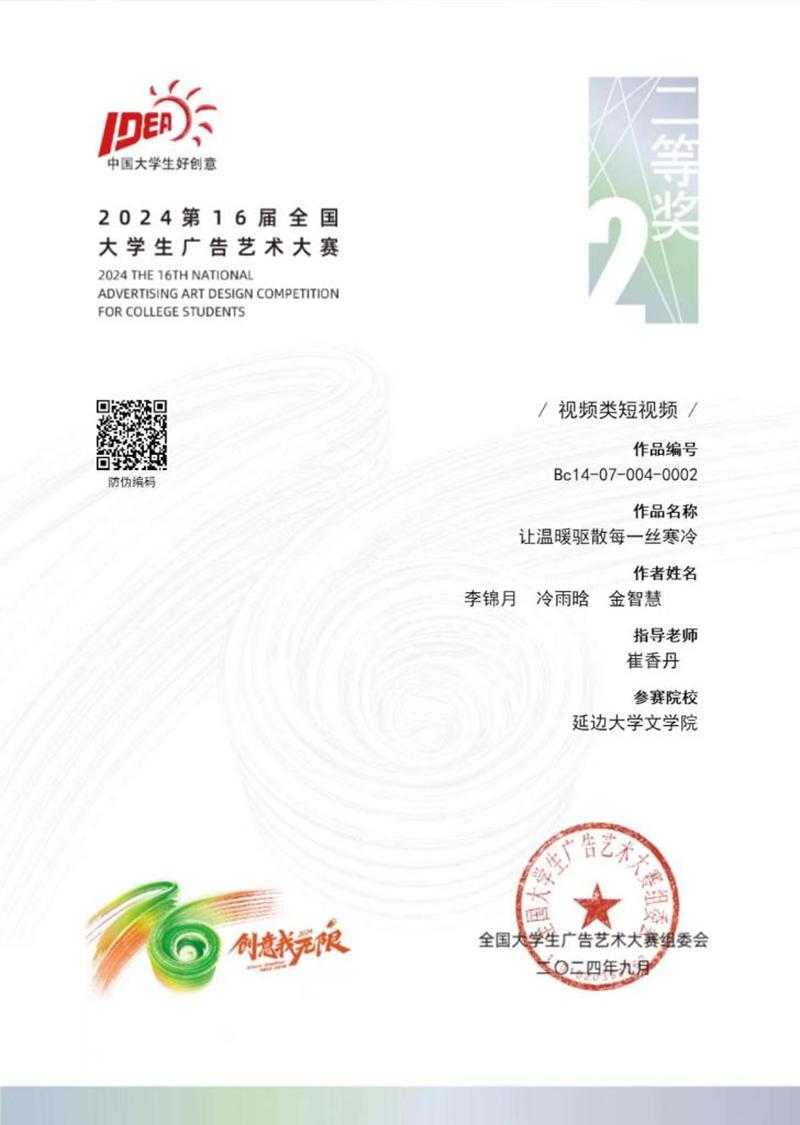 (教务处供稿)近日,第16届全国大学生广告艺术大赛获奖名单公布,经过激烈的角逐,金沙官网在全国赛区中斩获了视频类二等奖和平面广告类优秀奖,系金沙官网首次在该竞赛国赛中获奖。除此,金沙官网在吉林赛区中分别夺得一等奖1项、二等奖2项、三等奖4项、优秀奖7项,取得佳绩。