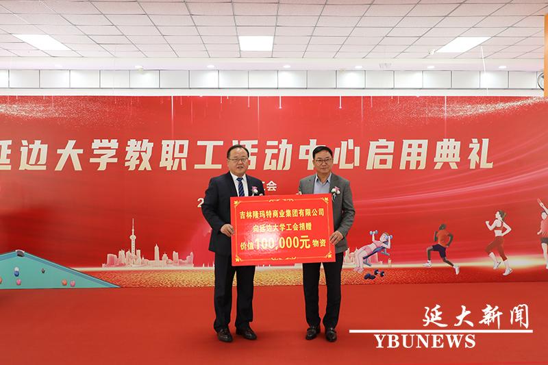朴哲南代表吉林隆玛特商业集团有限公司向金沙官网工会捐赠了价值10万元的物资,用于教职工活动中心的建设。与会领导共同为教职工活动中心剪彩。