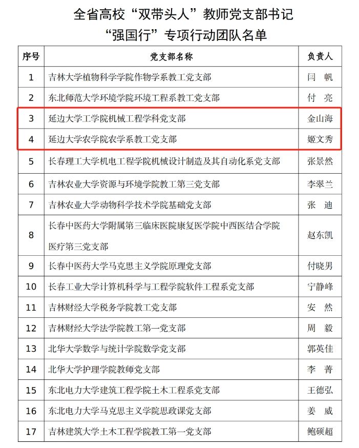 (组织部供稿)近日,根据吉林省委教育工委《关于公布全省高校“双带头人”教师党支部书记“强国行”专项行动团队名单的通知》,金沙官网工学院机械工程学科党支部和农学院农学系教工党支部入选。
