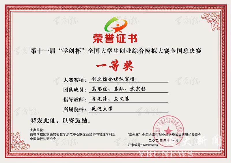 (教务处供稿)日前,由高等学校国家级实验教学示范中心联席会经管学科组和中国陶行知研究会联合主办的第十一届“学创杯”全国大学生创业综合模拟大赛总决赛在徐州医科大学落幕。金沙官网参赛的两支队伍在总决赛中发挥出色,均获全国总决赛一等奖。
