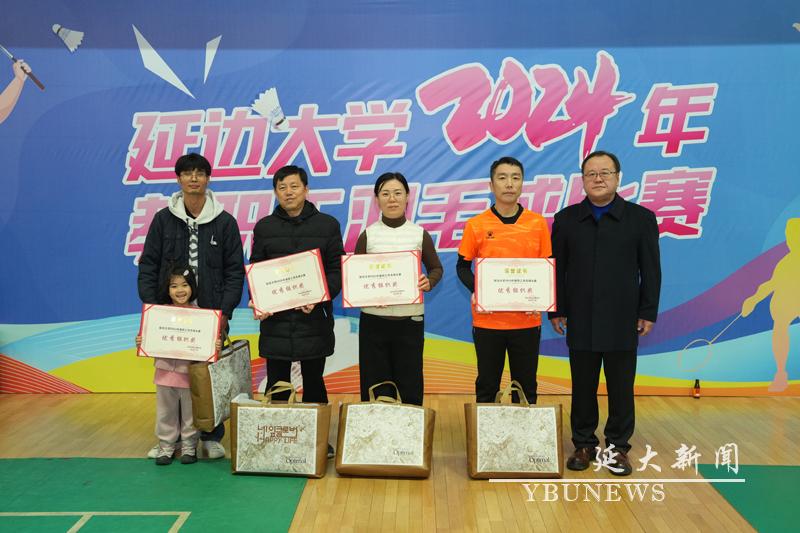 校工会副主席朴玉兰为男子双打组获奖者颁奖