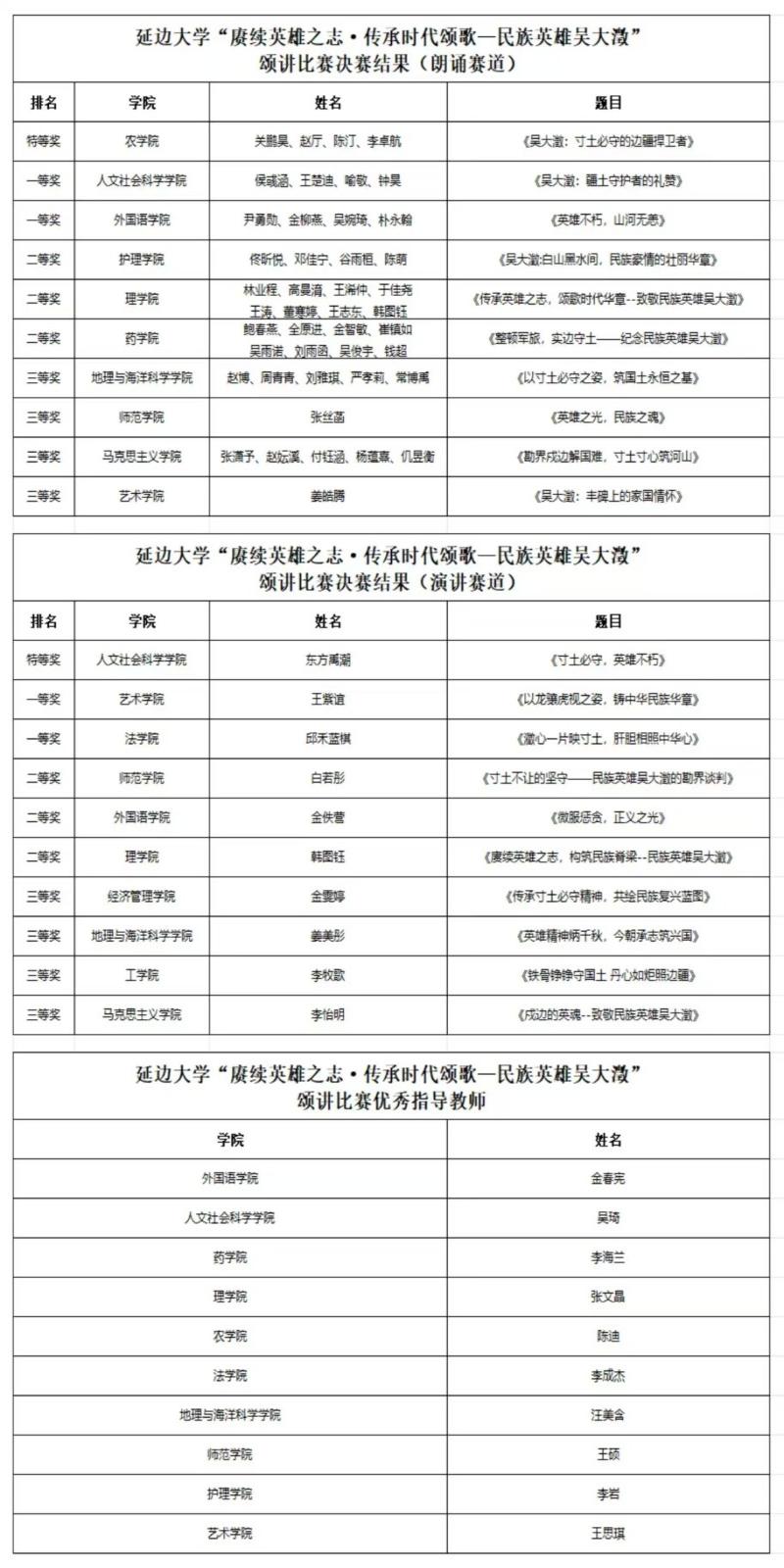 经过激烈的比拼,在朗诵赛道中,农学院团队荣获特等奖;人文社会科学学院、外国语学院等2个团队荣获一等奖;护理学院、理学院、药学院等3个团队荣获二等奖,4个团队荣获三等奖;在演讲赛道中,人文社会科学学院东方禹潮同学荣获特等奖;艺术学院王紫谊、法学院邱禾蓝棋等2名同学荣获一等奖;师范学院白若彤、外国语学院金佚营、理学院韩图钰等3名同学荣获二等奖,4名同学荣获三等奖。10位老师荣获“优秀指导教师奖”。评委组代表、师范学院副院长何永贤对本次比赛进行了点评,与会领导为获奖团队、选手和优秀指导教师颁奖。