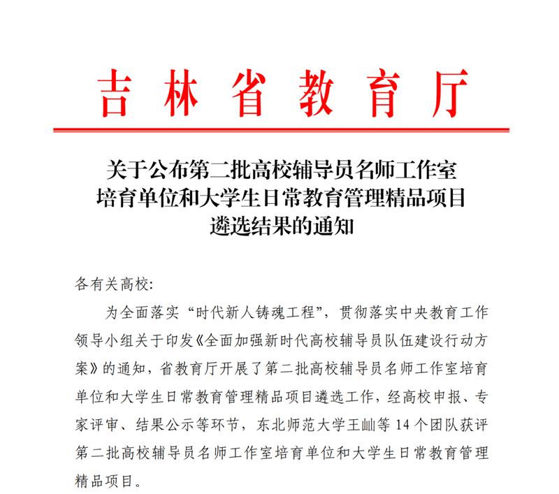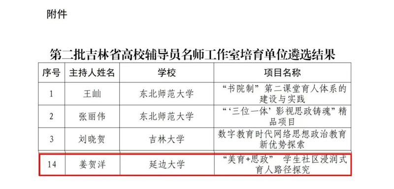 (学生工作部供稿)近日,吉林省教育厅发布了《关于公布第二批高校辅导员名师工作室培育单位和大学生日常教育管理精品项目遴选结果的通知》。经学校党委推荐、吉林省教育厅专家评审和公示等环节,吉林省共14个团队入选,金沙官网辅导员姜贺洋主持的“美育”明礼立身辅导员工作室及其团队项目“‘美育+思政’学生社区浸润式育人路径探究”获评高校辅导员名师工作室培育单位和大学生日常教育管理精品项目。