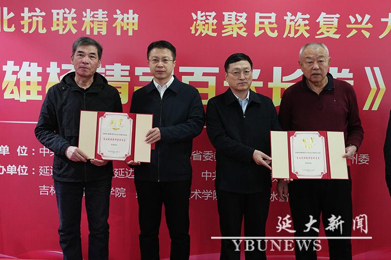 吴月冬、辛峰向马继志、赵明仁颁发了“吉林省东北抗联精神宣讲专家”聘书;学生代表为马继志、赵明仁和组画创作团队成员孙丽献花;与会领导、嘉宾、师生共同参观了画展,在学校师生讲解员深情的讲解中,共同重温那段白山黑水间写下的不朽史诗;与会领导、嘉宾随后共同参观了学校铸牢中华民族共同体意识展示馆。